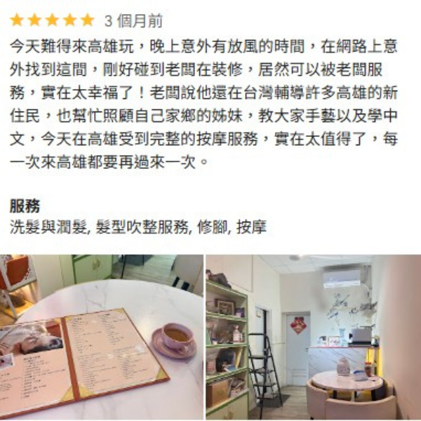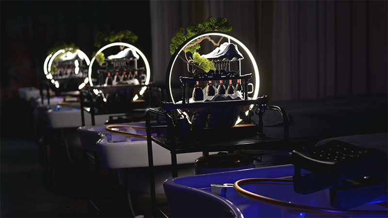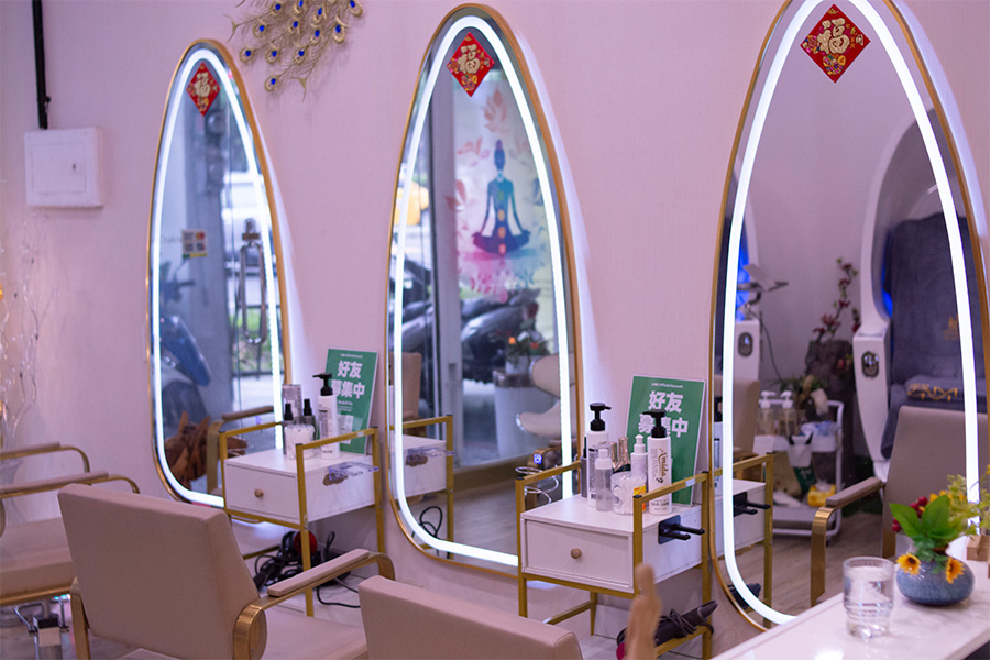 店內環境精心規劃,柔和燈光、香氛、舒適座椅,營造寧靜氛圍;採預約制,確保每位顧客都能享受完整服務流程。