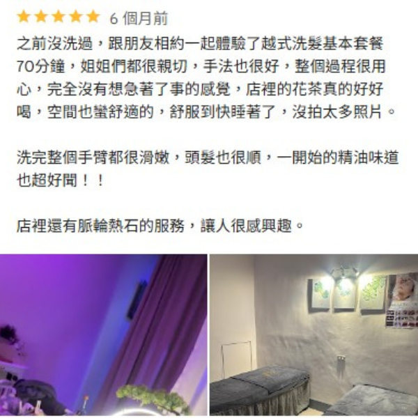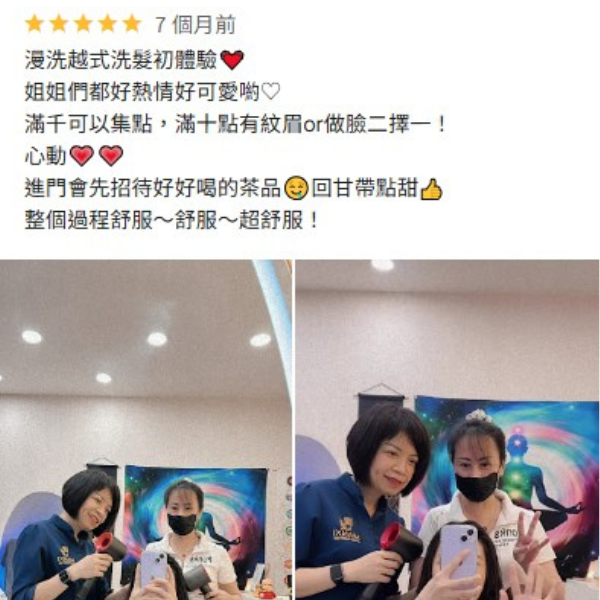 我們使用專業洗護用品搭配越式洗髮流程,讓髮絲與頭皮同時放鬆、重生。